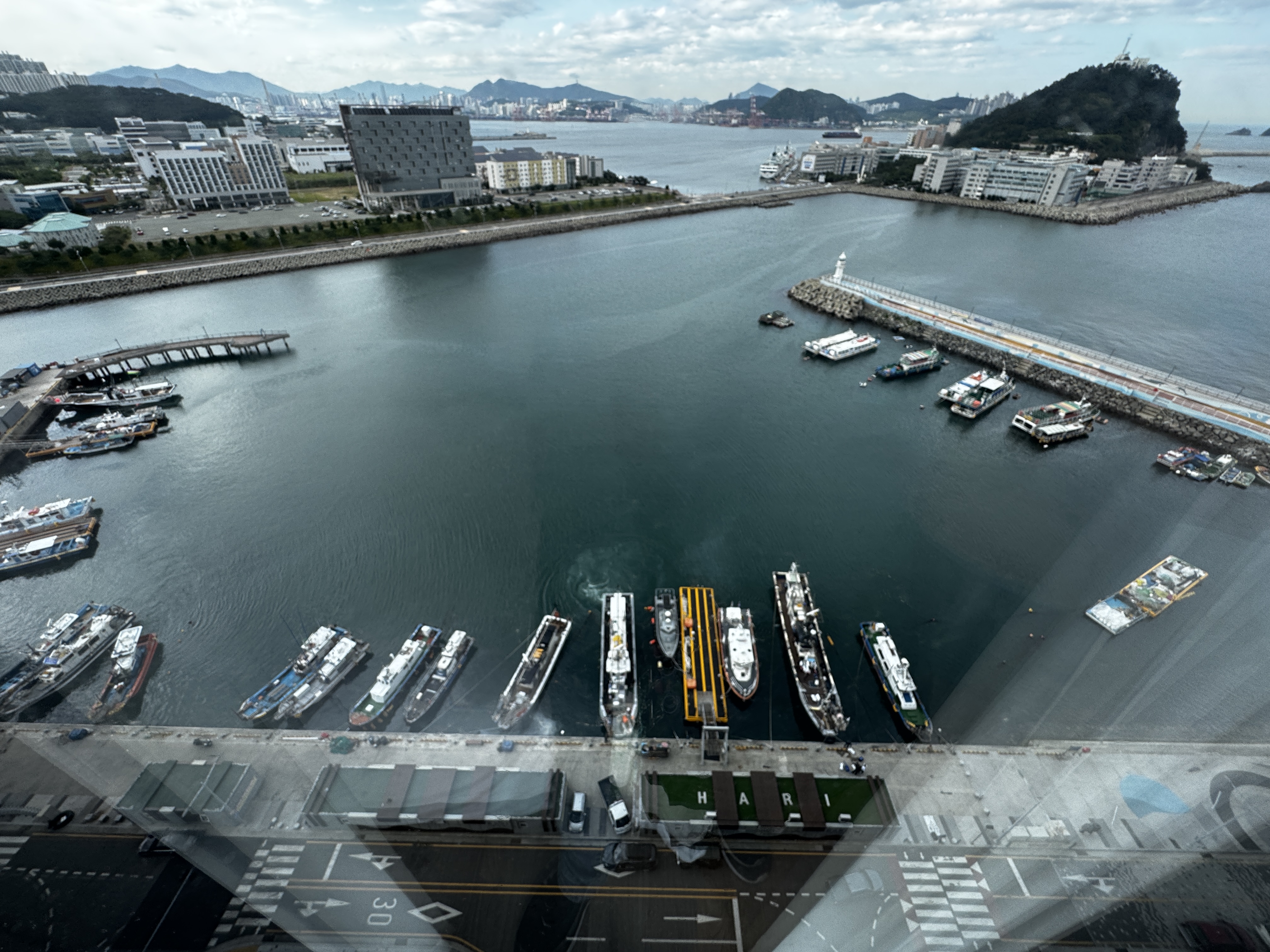 카드키를 대고 객실 문을 열자, 제 눈에 가장 먼저 들어온 것은 침대나 TV가 아니었습니다. 방의 한쪽 벽면을 가득 채운 거대한 통창, 그리고 그 너머로 펼쳐지는 비현실적인 풍경이었습니다. 거대한 캔버스처럼 자리한 창밖으로는 부산항의 푸른 바다와 그 위를 웅장하게 가로지르는 부산항대교가 그림처럼 펼쳐져 있었습니다.